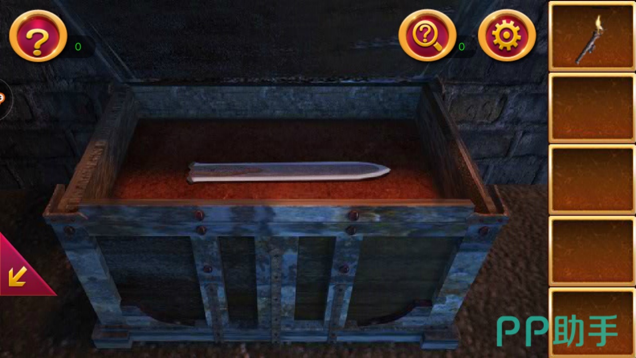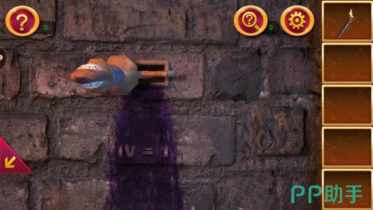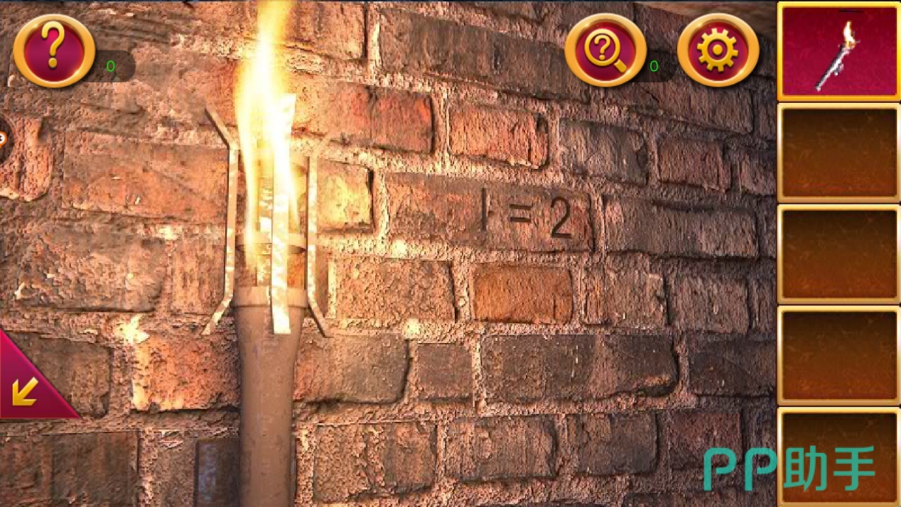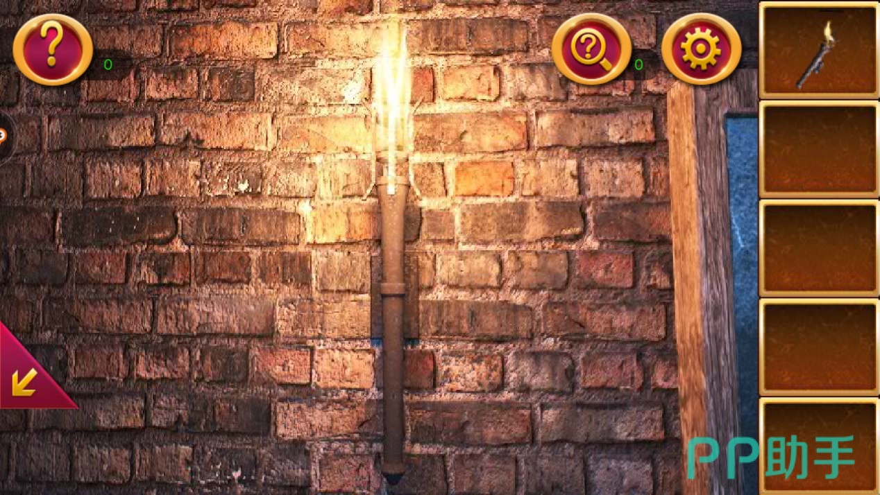 第四关又到了一个房间里,想要逃脱需要打开屋子里的唯一一扇门。按照解密的思路,道具和线索是非常重要的,收集到足够的信息后解密就会变得轻松简单了。左下角有一根火把,先收集到工具栏里,然后再用房间里燃烧着的火把将它点燃,这样就得到了一个新道具——燃烧的火把。