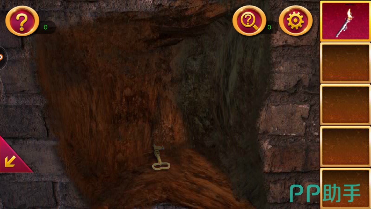 房间左侧的墙壁上有一个黑漆漆的洞,使用火把照亮,里面有一把钥匙,可以用来打开一把锁,将它收进道具栏中。