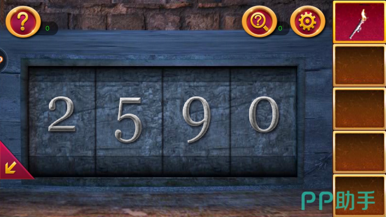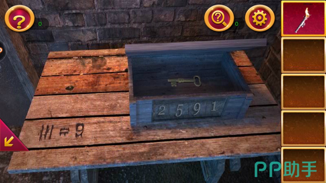 数字线索收集完毕,按照线索大小顺序从左往右使用密码2591拨动木头密码箱的密码锁打开它,得到最后一个道具——一把钥匙。