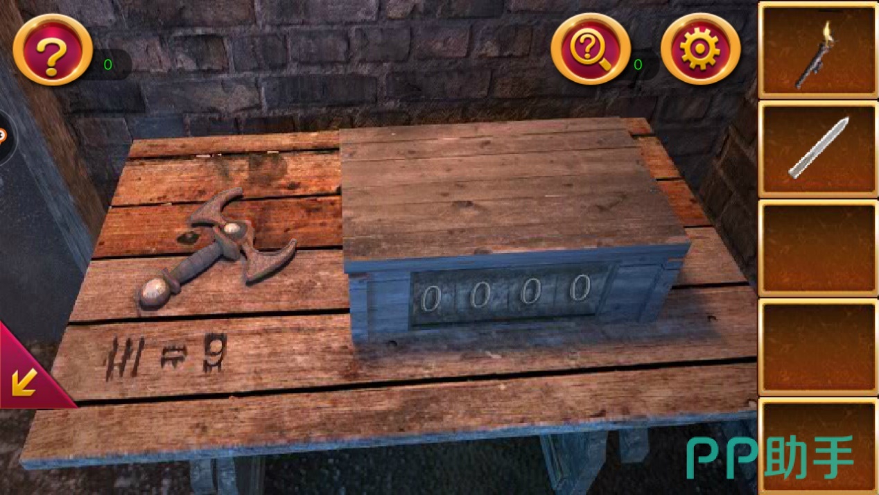 查看右侧的桌子,获得剑柄,然后将剑柄和剑合成得到一把完整的剑。同时可以得到桌子上的密码III=9,桌子上还有一个密码箱,之前收集到的所有数字线索就是打开木头密码箱的密码。