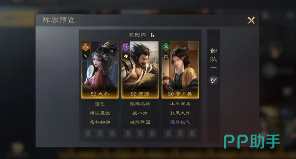 在阵容搭配方面也别忽视,可以选大乔+庞德+黄月英,在搭配好阵容之后,战法也应该注意大乔可选择青囊急救。庞德可选择威名显赫,黄月英选择运筹帷幄。