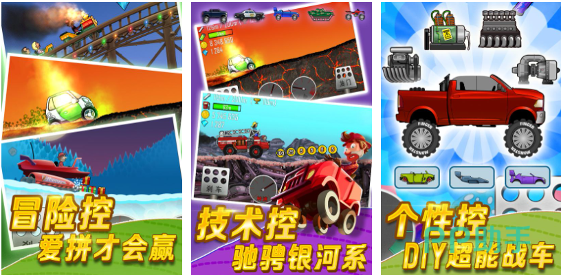 登山赛车这款特殊的横版赛车游戏画面塑造呆萌有趣,很简单的双按键操作就可以驾驶赛车进行冒险,跌宕起伏的山地、满地泥水的沼泽等复杂地图等待玩家征服,各种类型的配件都支持玩家自由安装在赛车上,滑稽有趣的赛车驾驶过程给玩家带来了忍俊不禁的感觉,形形色色的奇葩赛车也为这款山地竞速类游戏润色不少。