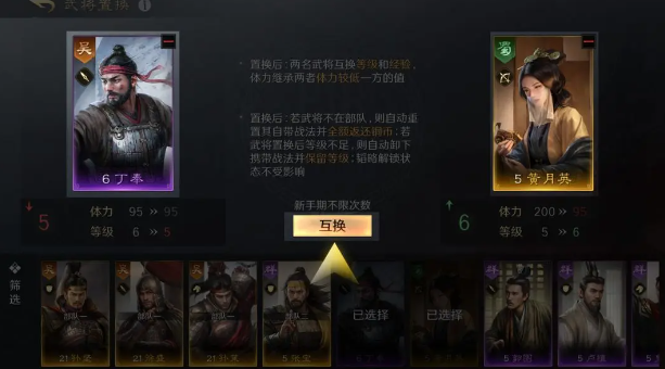 在置换时内容也比较简单,主要置换的是武将的经验,还有等级可以达到互换的效果。如果其中一个比例或者等级比较高,那么在经过置换时就可以互换。武将在置换后,如果并没有出现在队伍中,这就意味着就可以自动的把战法重置,还会把所有的铜币全部返还。从这里就可以看出武将置换的方法还是比较简单的,玩家如果有兴趣就不要错过。