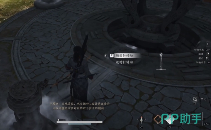 玩家们在月隐山山顶跳下悬崖来到隐藏地道后,先救出被困住的NPC,便可开启太极之谜。这个谜题主要有一个转盘和四个可转动的龙头组成,其中转盘处有两个圆形的图案,它们所对准的龙头若是发生转动,另一个也会跟着转,而龙头喷出雾气的方向为正方向,这些在等下的解密中都会用到,还望玩家们能牢记。
