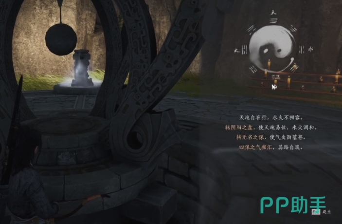 如果此时天地龙头呈相对的状态,可将转盘上的圆点转至水火龙头处,然后再去转动天地龙头,使它们分开。进而再次转动圆盘,便能达成四象交汇的现象,完成太极之谜。该谜题解开后,转盘会向下降,并露出前往下层的通路。