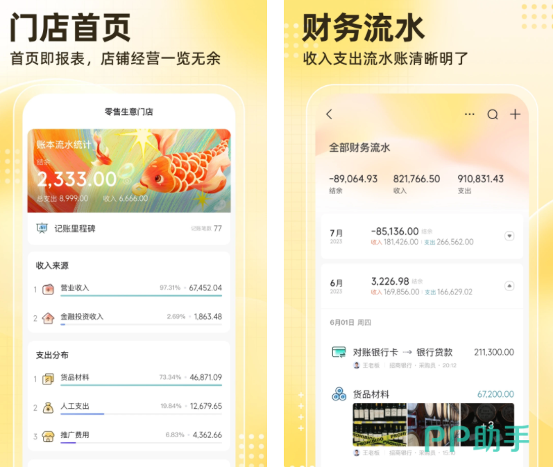 可以绑定个人零售生意门店,首页立刻显示财务报表,店铺经营状况一览无遗。而且可以登记商品出货、进货的库存,还支持多个不同门店的财务业态管理。