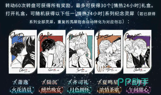 大家转动60次转盘就能得到所有的奖励了,像24小时礼盒最多可以得到30个,能够随机获得系列灵犀奖品,比如萧的火花清晨,陆的醺然晚宴和齐的月色拥怀,以及夏的浓情茶歇和查的午间甜心。