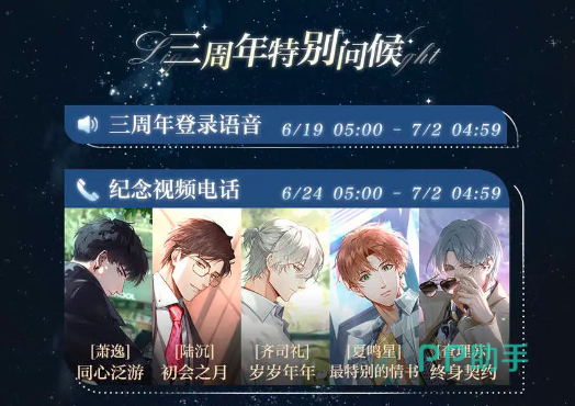 另外大家在这个时间段上游戏的话,还可以领取五位男主专属的周年上线语音和纪念视频电话以及短信。此次增加了全新的功能双摄相伴,大家可以参与聆心相伴的新玩法。此外,现在小伙伴们更新之后还可以设置多条语音登录随机播放,可以定制自己的专属语音效果。