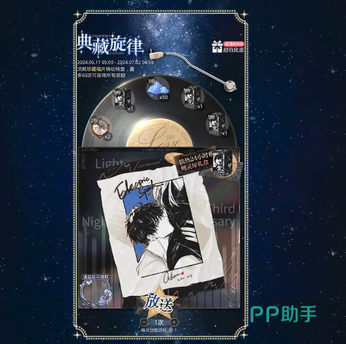 本次光与夜之恋三周年活动有好几个部分,首先第一个给小伙伴们分享的就是6月17号到7月2号的典藏旋律玩法,大家可以通过消耗珍藏唱片的形式去玩转盘,能够得到礼盒、流年、培养材料等奖励,在转盘清盘之后还能够领取限定的头像框。