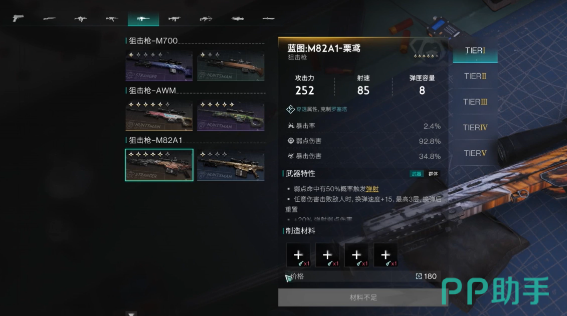 在游戏中,它的伤害也不容小觑, 和现实中的属性一样,也是远射程和高伤害,使用它的人能够精确地瞄准到敌人。它的攻击力有252,暴击率有2.4%,对于射程远的战斗来说是非常占优势的。这把枪还能够配置许多的配件,使得它的属性有所提升。装配狙击枪战术弹匣的话,就能够让它的换弹速度提升,机动性也能有效增加。另外,想要加强它的性能,玩家们还可以直接通过选择主效果和副词条来实现。拥有了M82A1,你就拥有了征服一切的快感。