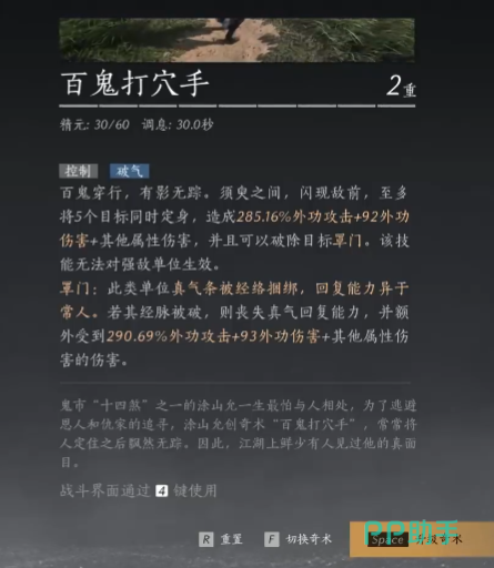 首先是”百鬼打穴手“这一内功,它可以让玩家直接闪现到敌人面前,最多可以同时将五名敌人给定住,并且还可以造成伤害。除此之外,还可以对目标敌人的罩门进行破除,不过如果是对那种boss强敌的话,这个技能就没有用了。