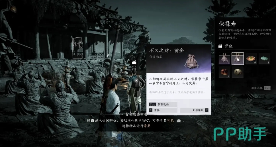 长老会给我们一个任务,去找一大堆珠宝,大家根据提示走就好了,找到之后就去给天泉长老,但是发现原来是别人假冒的,真正的天泉长老并不会向我们索要钱财,被发现之后一场大战一触即发,对方并不是很强,也是很快结束战斗的,打完之后大家要注意后面有个箱子,打开获得一个不义之财,接下来我们要回到获得珠宝的地方,那个人就是真正的天泉派的,也是不打不相识,接下来就可以准备拜师入门了,条件就是三个不义之财和60侠义值,侠义值大家基本都合格了,不义之财大家去将军祠找到伏禄寿按V然后用暗术偷取就好了,不义之财有很多种获得方法,都是可以用的。