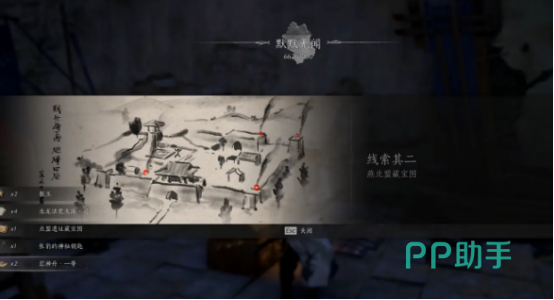 当清理完竟然见到的敌人之后,来到左侧校场击杀张豹,这样就能够获得第2个线索,之后我们也可以打开宝箱获得燕北盟藏宝图。根据图中提示就能够找到火焰机关的位置,然后点燃4个红圈。旁边帐篷当中还有一个宝箱,进去再打开。