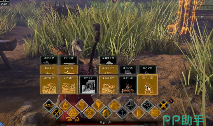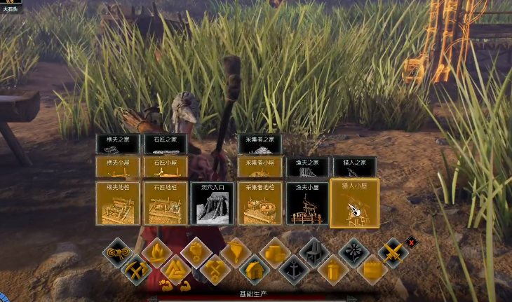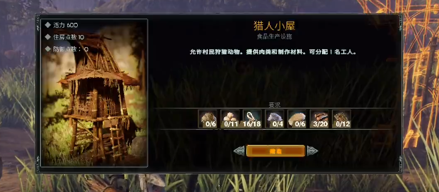 在ASKA游戏里面,村民们会有各种各样的天赋,不过想要获得猎人的天赋,还需要先开启猎人小屋。猎人小屋需要大家收集如下图对应的材料,然后在基础生产中选择猎人小屋,再找到一块空地放置即可。另外想要启用猎人小屋,需要玩家拥有弓和箭这两样装备,接着还要去野外标记一处野生动物,完成后猎人小屋就可以启用了。