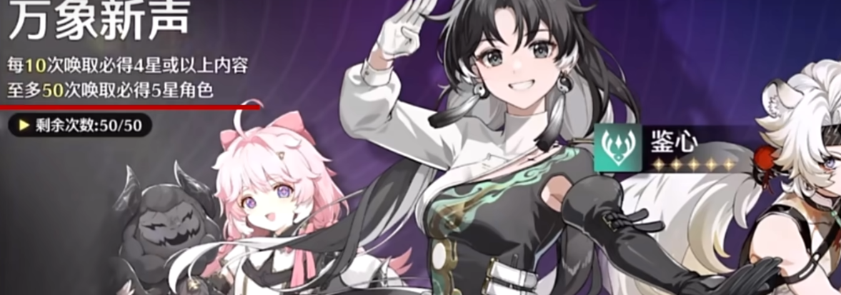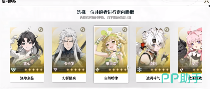如果玩家在新手50抽的时候抽到的是这三个主C里面任意的一个,玩家在选择定向五星的时候就可以选择最强奶妈【维里奈】具有复活和增伤的辅助技能,可以说是开荒期必备了。如果我们50抽已经抽到了【维里奈】建议大家选择【鉴心】有巨怪和增伤的效果,并且呢也有不俗的伤害能力,他的QT呢就是下一位角色的大招增伤38%。