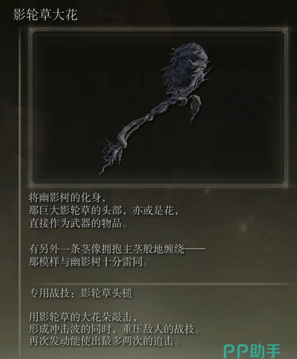 影轮草大花这把武器就是幽影树本体的一部分,如果你想攻击距离远威力大的近战兵器,这倒是一个不错的选择。战技可以让一些非霸体敌人发生硬直,并且会有冲击波压制敌人,再次发动还能进行额外的追击,即便玩家自己善于使用这把武器,带在身上让仿生泪滴作为你的复制体使用,也是个不错的选择。