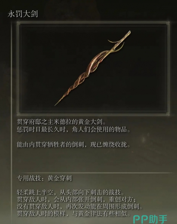 击败癫火之王就能去兑换他的武器永罚大剑,这是开局BOSS从头部拔出来的武器,虽然过场动画中癫火之王十分恐怖,但这把武器却还挺好用。除了外观看起来比较拉风之外,这把大剑的战技也很好用,可以让角色跳起来使用武器贯穿敌人,伤害可观的同时高跳跃也能让你躲掉一些地面判定的技能,保自己一命。