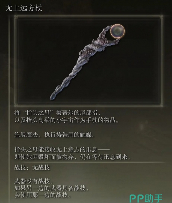 指头之母梅蒂尔有追忆可兑换的两个选项都是武器,一个是法适用的无上远方杖,没有战技但是会复刻玩家另一把武器的战技,一般法师还会携带一把暗月剑来防身,也就是说有了这把法杖用月光斩击就不用再把剑掏出来了。