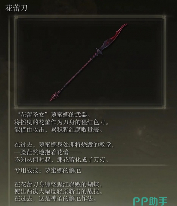 花蕾圣女罗蜜娜手上的那把花蕾刀,有着被猩红污染的外观,作为长刀攻击距离也相当不错,并且用起来也不是那么沉重。战技会让玩家发出两段具有蝴蝶特效的斩击,穿插在玩家的连招中也十分丝滑,在众多传说武器中,这把刀的手感显得相当不错,值得去进行兑换。