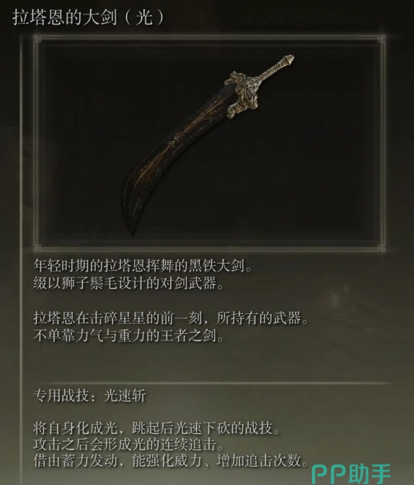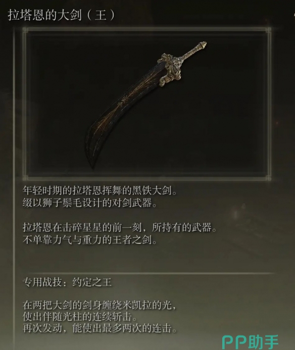拉塔恩作为最终BOSS自然也会有追忆,你可以兑换BOSS使用的大剑中系列的一种,每一种都是对剑,也就是俗称的双刀。首先是拉塔恩的大剑(王),这个版本的对剑战技会暂时让玩家武器受到米凯拉的光之祝福,随后你可以伴随光柱发出连续斩击,最多可以追加两次连击。