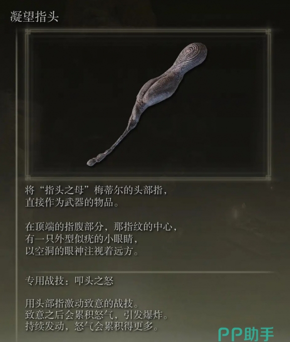 凝望指头是近战职业用的武器,战技会让玩家叠怒气并引发爆发,但实际上不太好用,因为实战时你根本没那么多闲暇去叠怒气层数,所以即便是不换也没什么损失。