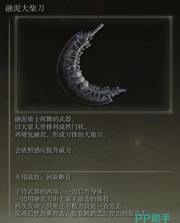 融泥骑士的追忆可以兑换融泥大柴刀,外观方面在BOSS战应该已经见识过了,是一个半月型的弯刀,以人的骨头制成,观感上比较恐怖。这把刀适合精力条,也就是耐力值点的比较高的玩家,因为只要玩家有精力的话,就能一直通过战技发动追击。若你根本没怎么点耐力,精力较少那么这把刀比较累赘,因为自己的精力只能留着闪避翻滚,不停的浪费只会让自己在BOSS战陷入危险。
