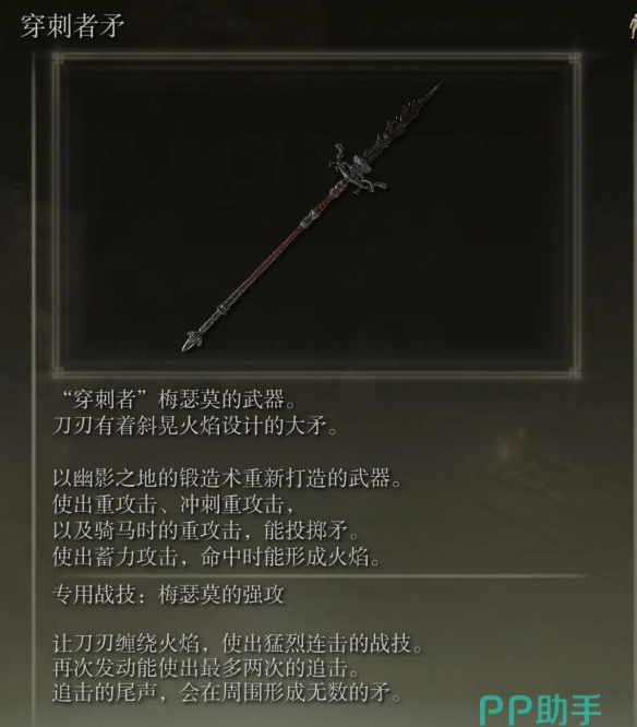 梅瑟莫的穿刺者矛非常值得去兑换,特别是在骑乘时可以通过重击投掷长矛,形成火焰。在地面使用时也可以暂时让刀刃缠绕火焰打出连击,最多允许有两次追击,并会在追击结束时形成无数的长矛,无论你是平常打BOSS还是骑着马去探索,这把武器都会有用武之地。