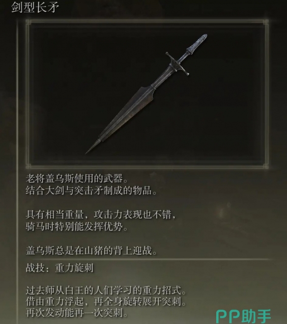 老将盖乌斯的剑型长矛,在分类上是一把大剑,虽然其貌不扬确实一把传说武器,玩家如果喜欢手感沉重但是攻击力高的武器,这是个不错的选择。另外技能的旋转突刺连段也非常适合追击,弥补了重型兵器的机动性,若你是刚玩魂游的新手,这种沉重的手感或许你会不太适应,需要多习惯一段时间。