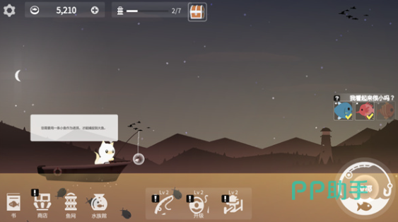 在游戏中,有只小饿猫眼巴巴地等着大家帮它找吃的。大家得先领着它过新手关,拿到一个钓鱼竿,然后钓上第一只鱼。搞定这个挑战以后,大家就能挣到金币,然后给小猫买艘小船。有了船,大家和猫咪就可以一起开船去水上钓鱼。在海上,大家得好好操控小船,想办法把鱼群吸引过来。而且,还得随时准备应对一些意想不到的情况,这可得看大家的反应快不快了。