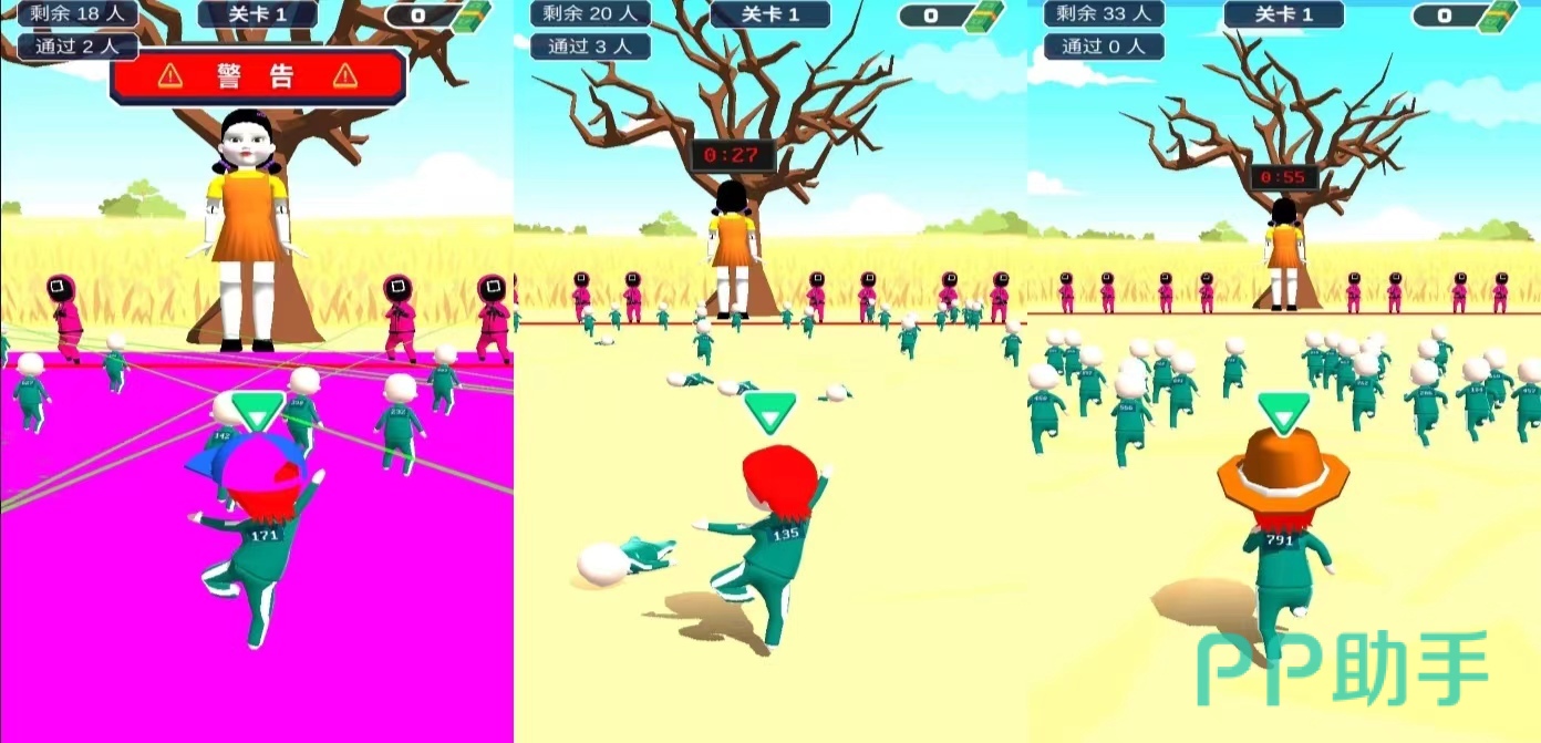 《123木头人》这款游戏是根据鱿鱼游戏的影视作品改编的,整个游戏的过程会经历到非常愉悦的闯关当中,游戏里面加入了非常多卡通的风格,可以在几个不同的小游戏之间做选择,也可以把所有的内容都体验一遍。在每一个游戏中都需要玩家小心谨慎,就像影视作品中一样是没有回头路的。在每一局开始之前,玩家都会扮演一名角色,和在场上的所有选手进行比拼。