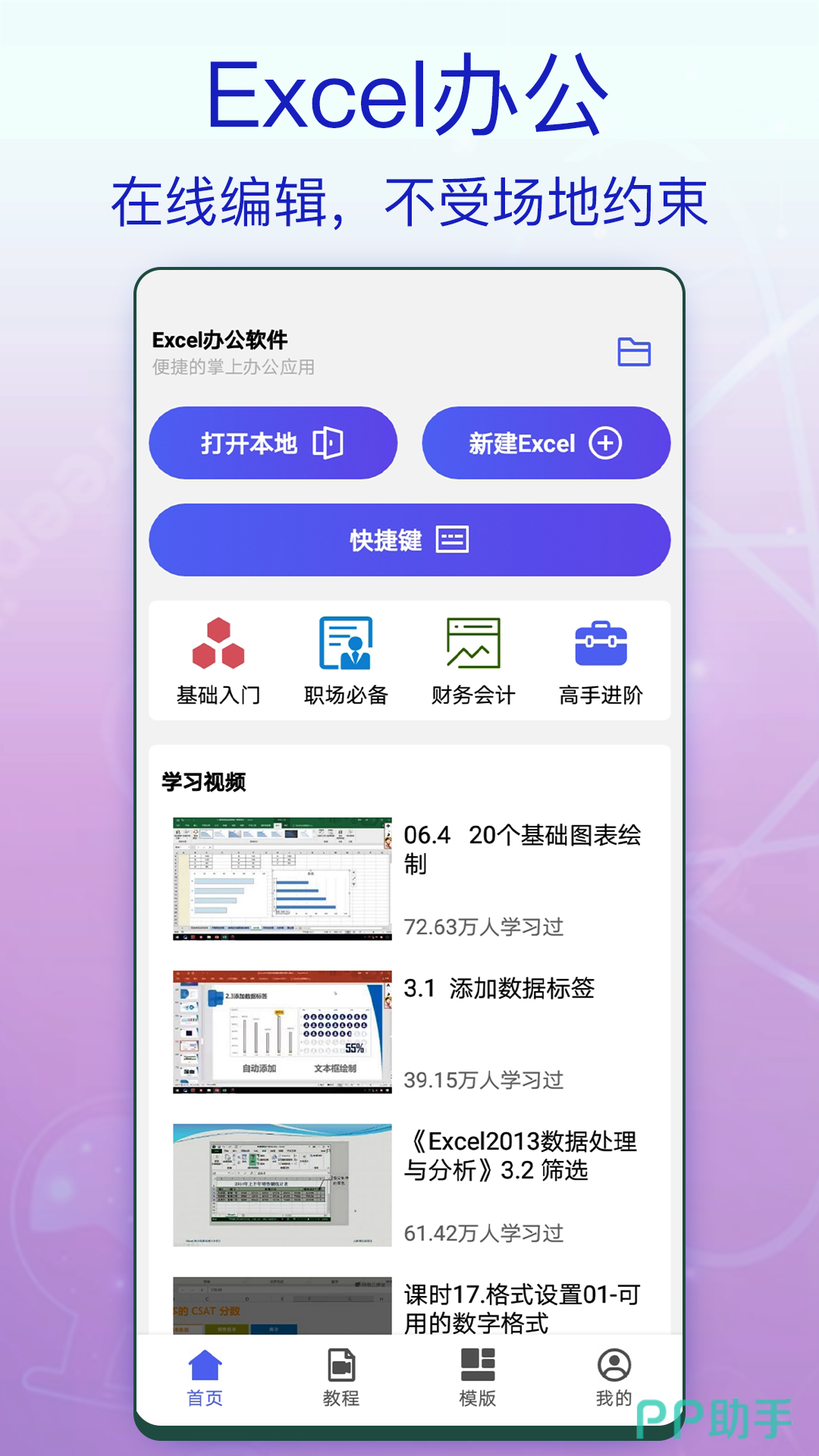 这是一个可以在移动手机端制作excel表格的办公软件。基本上每个进入职场的小白都需要学习excel表格的使用方法。为了让大家更好更快的掌握excel的使用方法,在这款软件上有许多免费的教学视频和操作步骤的指导。