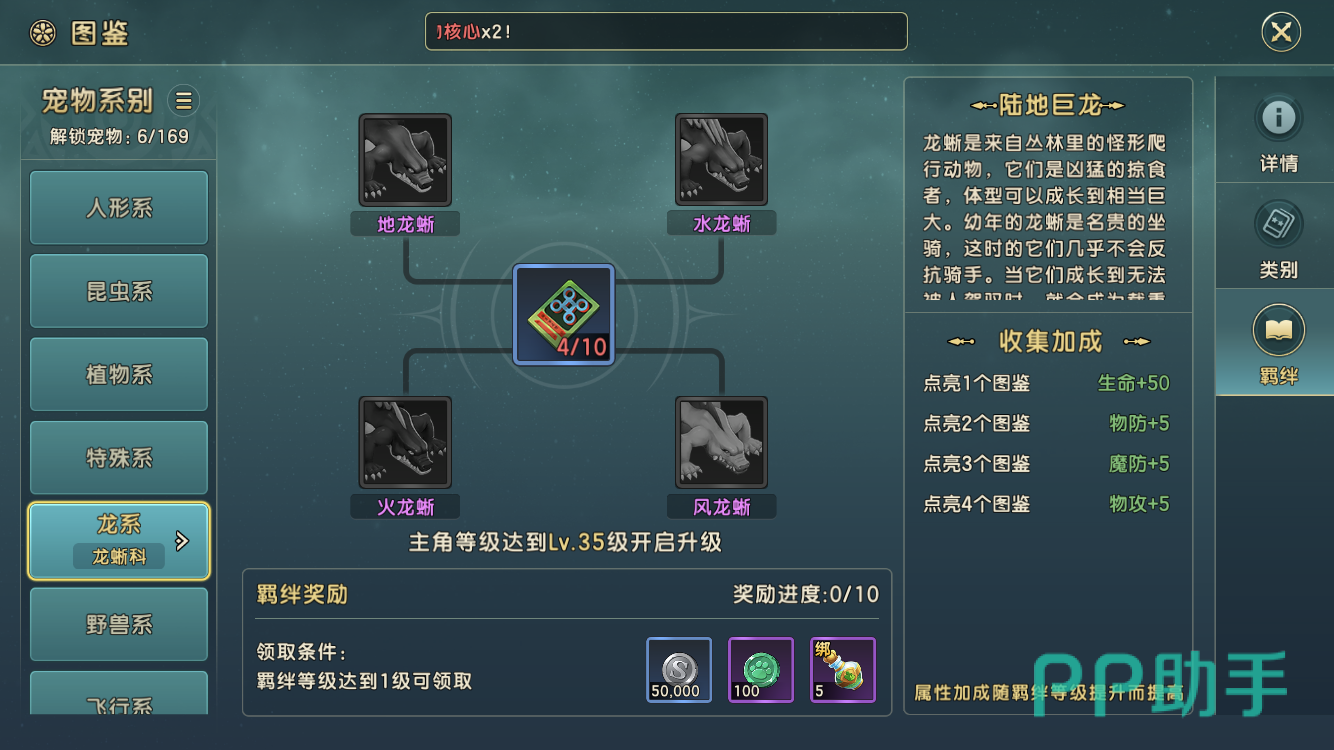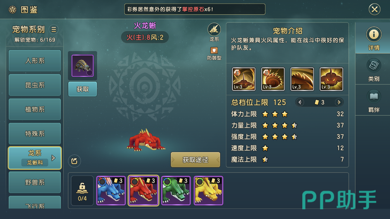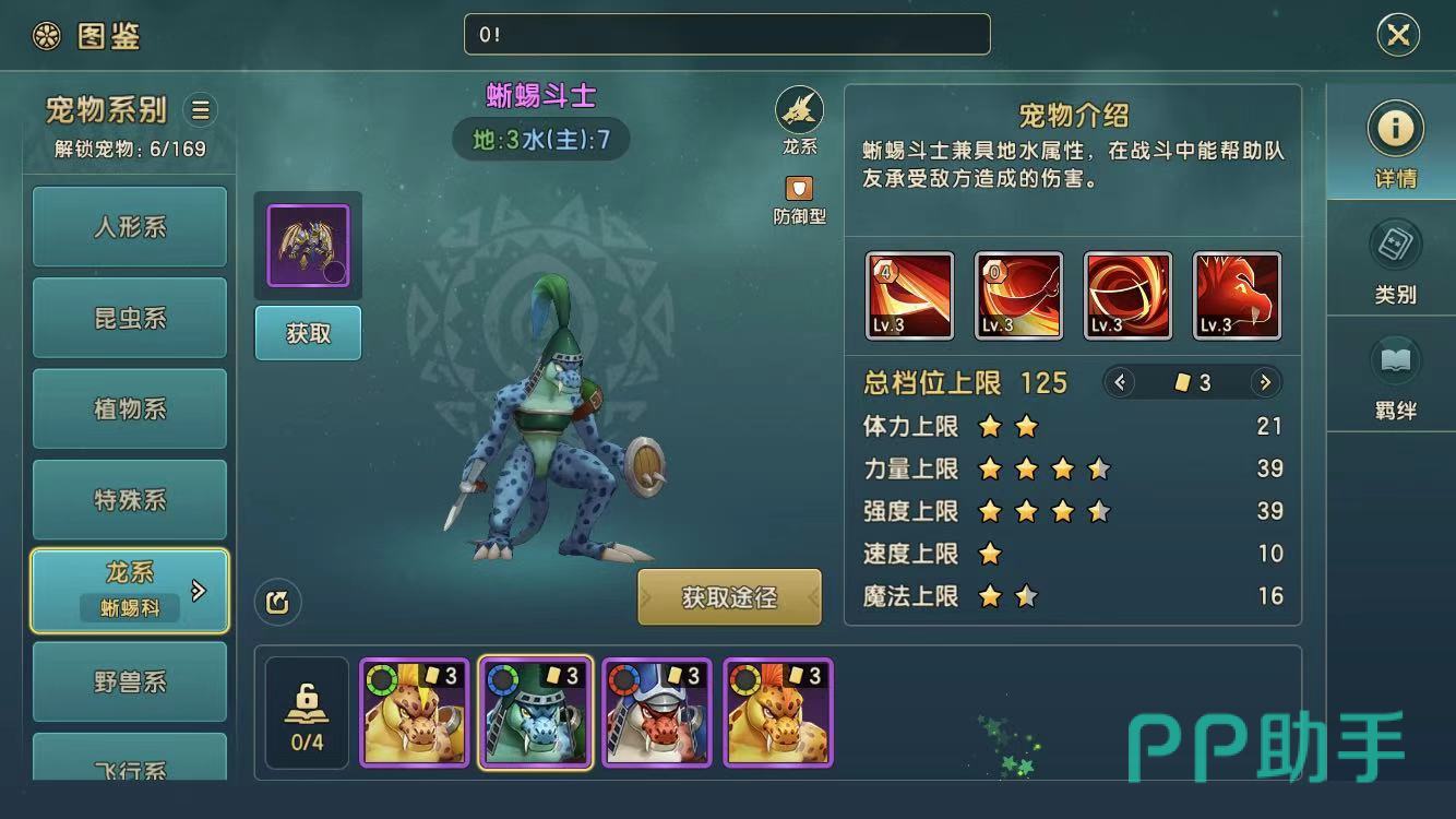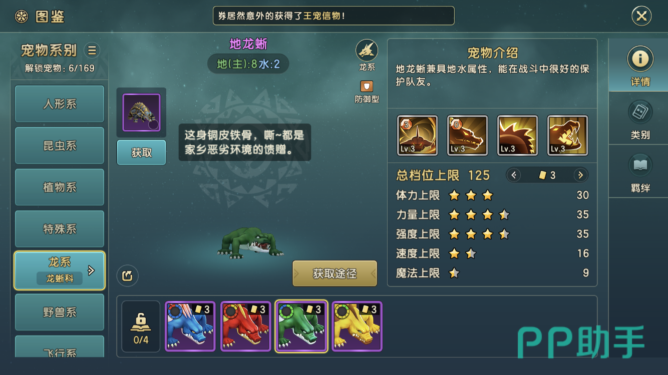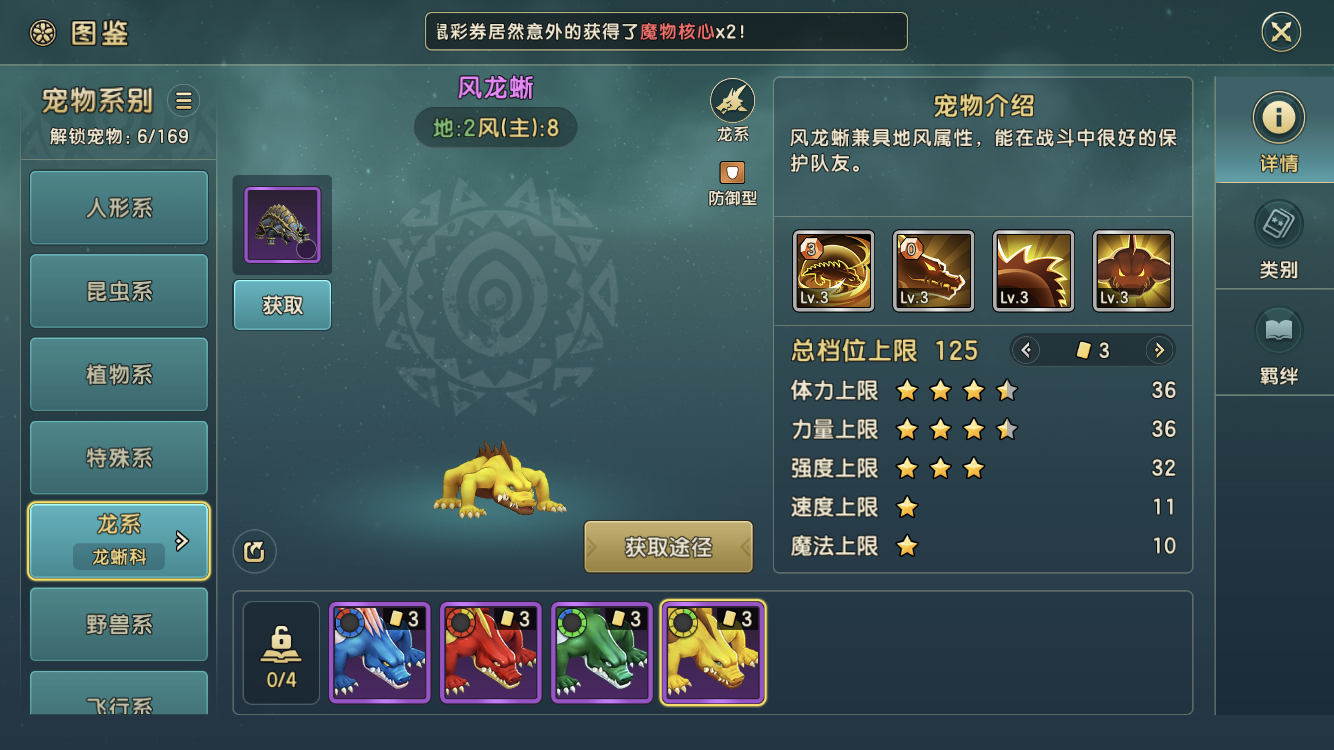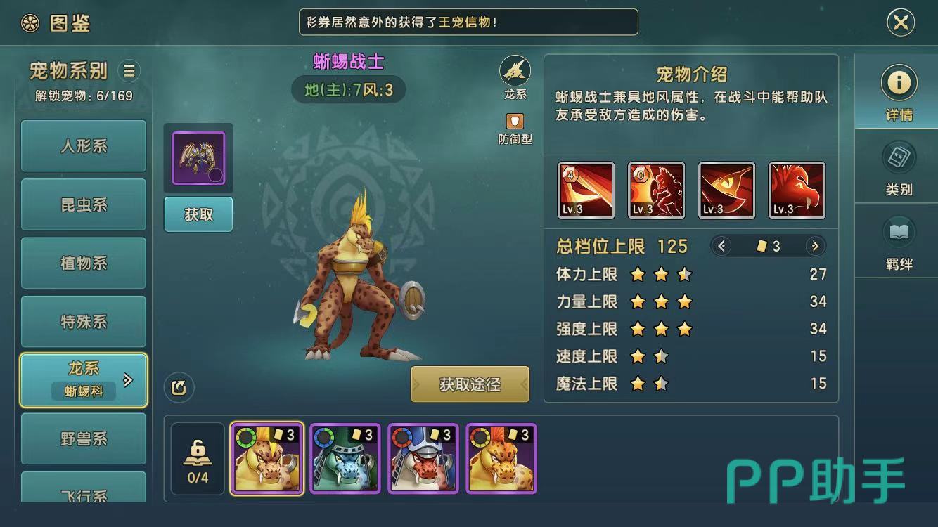 3、地龙蜥:地属性宠物。主动技能【以眼还眼】造成物理伤害并返回伤害给敌方;被动技能【尖刺皮肤】提升反伤概率和提升自身物防。大招技能【龙族引力】。
