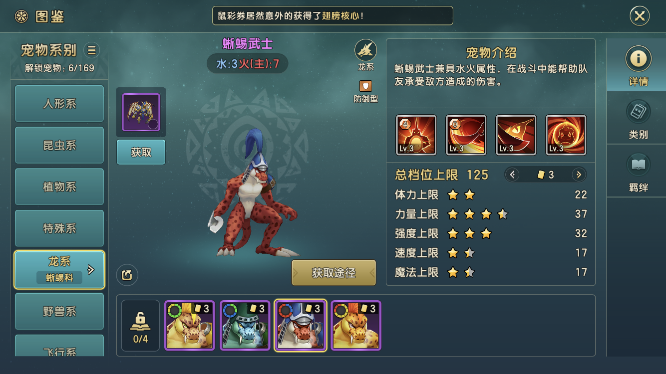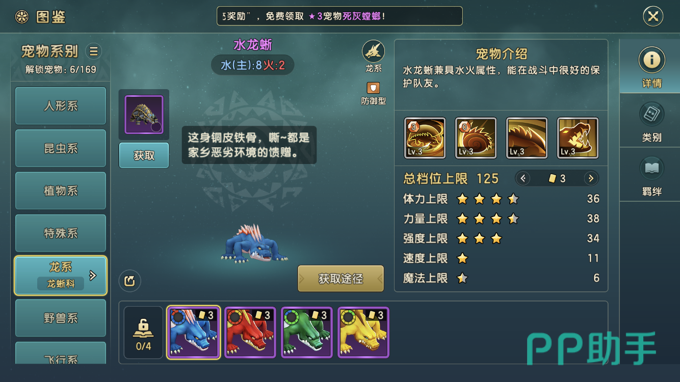 1、水龙蜥:水火属性宠物。主动技能【背刺攻击】造成物伤并提升自身物防;被动技能【坚韧倒刺】提升反伤概率,触发反伤时给对方减伤3个回和;大招技能【龙族护卫】先发技能,全局提升免伤和全体守护效果。