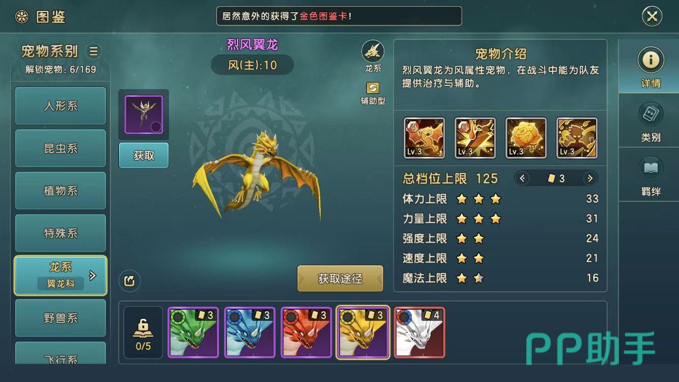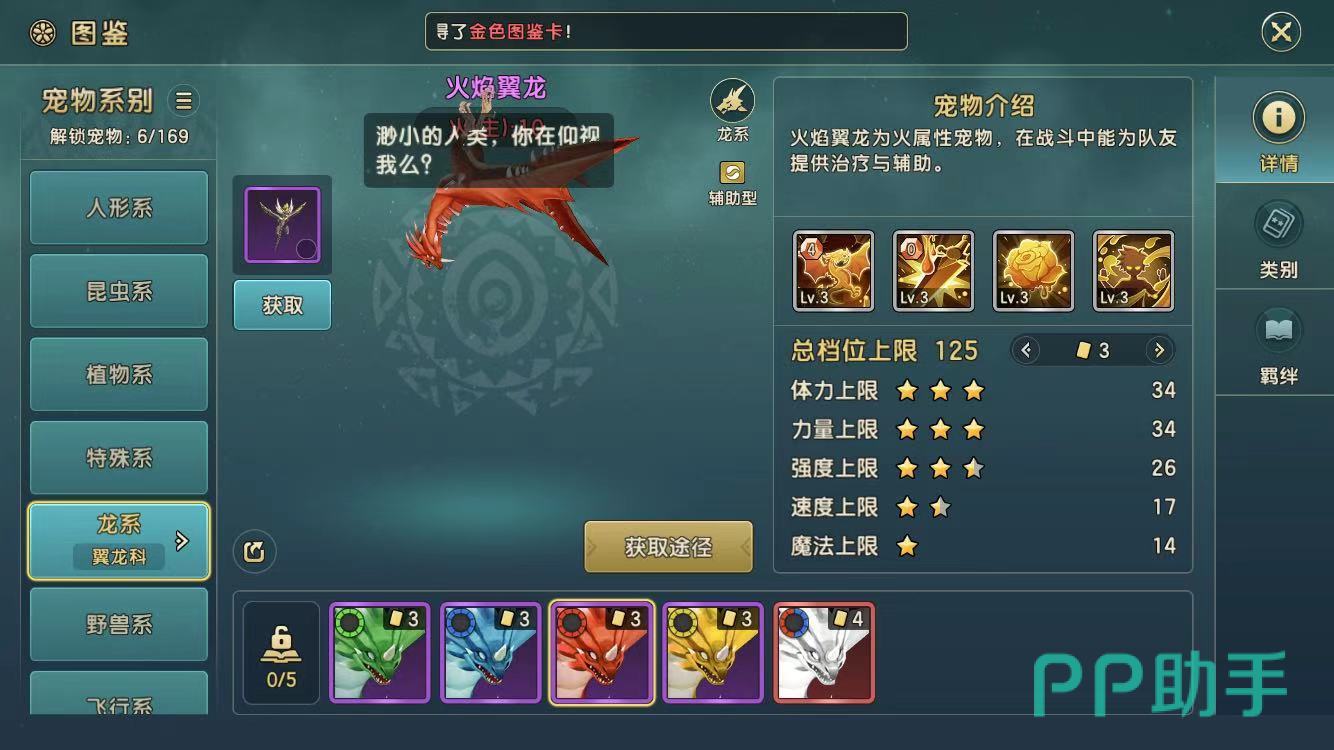 4、风龙蜥:风属性宠物。主动技能【以眼还眼】,被动技能【尖刺皮肤】,大招技能【龙族护卫】。