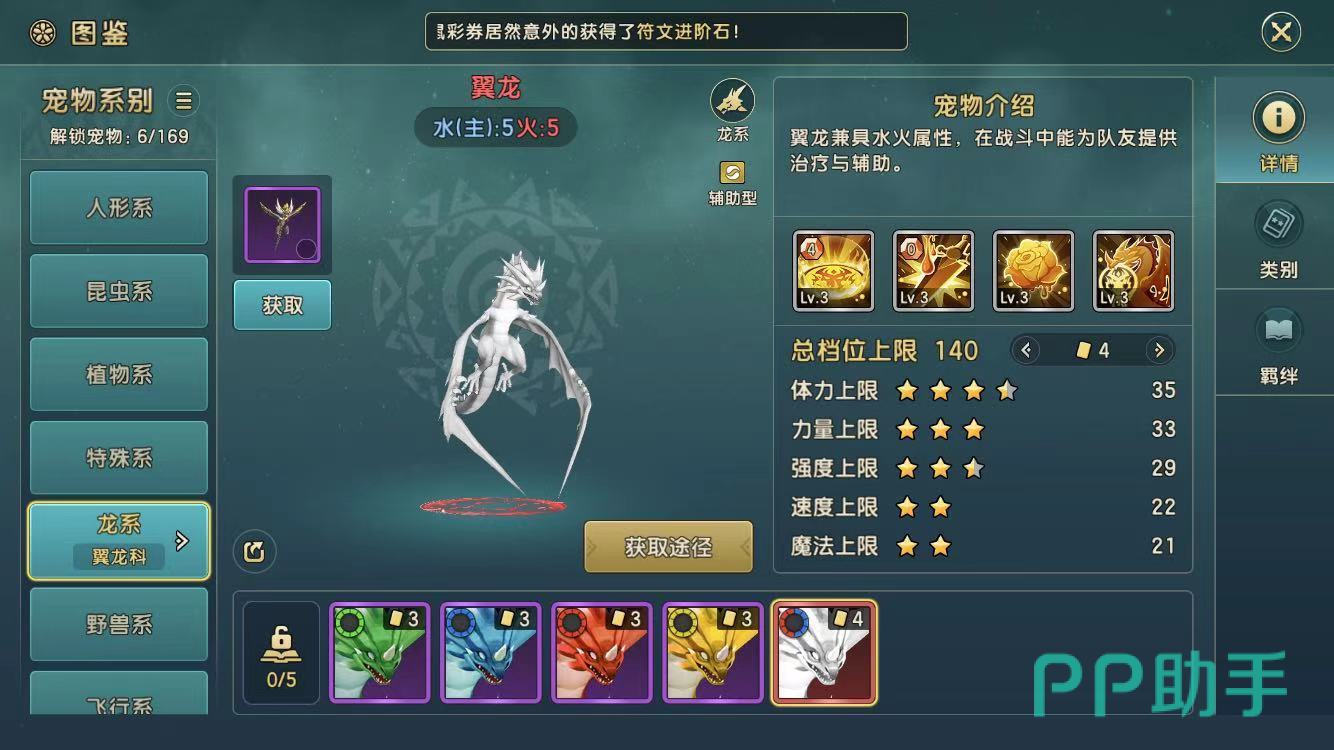 5、翼龙:水火属性宠物。主动技能【龙血淬炼】,被动技能【生命绽放】,大招【翼龙赐福】。