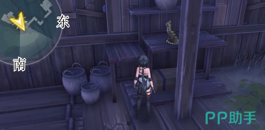 第二个区域在桃源乡上方点位。传送出来后往地图的南方向飞,随后看到右前方有一个平台,平台上面有几张桌子。到达该位置后,继续往南方向走,走到前方的楼梯处。在斜坡和平地交接处的位置,往左侧看,也就是地图的东方向,靠着山体的木箱子上有一个。紧接着打开地图,传送到潮生崖最下方沿海的点位。往地图东方向看,一直向前走,在前方的房子处跳下来,有一本书籍就在黑条纹灰猫的下方。