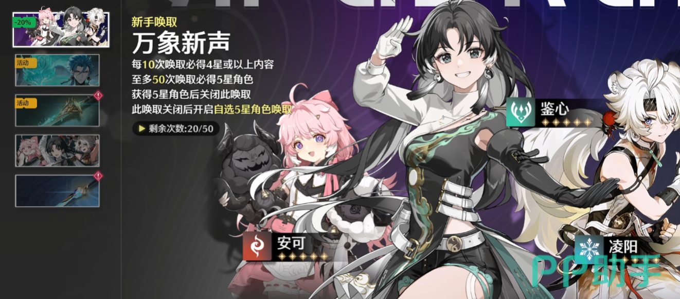 那么在角色卡池中,最开始是有一个新手唤取卡池的,这里的保底是五十抽,也就是五十抽之内我们可以必得一个五星角色,运气好的话可能十次就能直接出一个五星角色。在这个卡池中我们只能进行十连抽,不过它是打八折的,也就是说每次只需要花费八个唤声涡纹就可以进行一次十连抽,运气不好的话顶多也就40抽就可以获得五星角色了,也就是说差不多在三十级的时候就可以获得一位五星角色,还是很人性化的。
