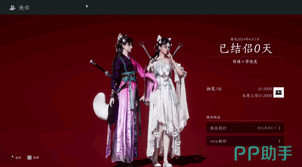 结为侠侣后,界面就不再是单人,而是两人在一起的状态,并且里面的表情、动作、位置都可以自由调整。