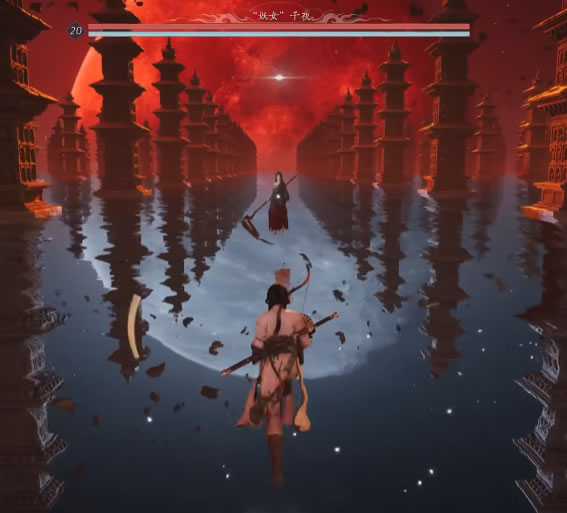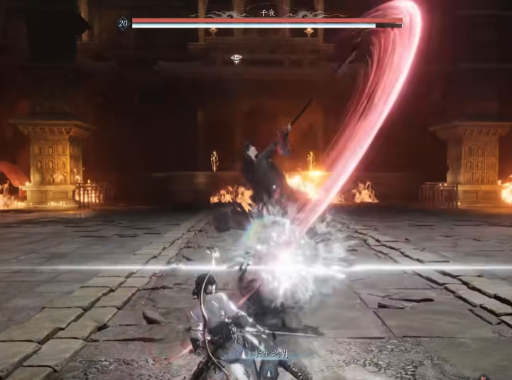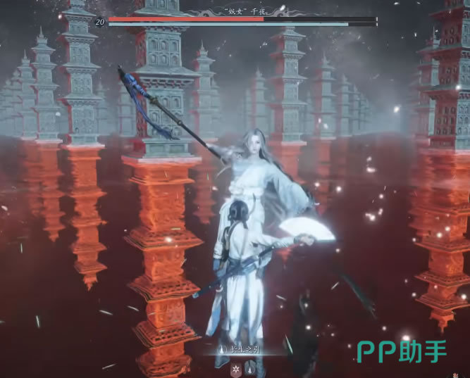 第二阶段切换到一个新场景中,同时千夜也发生了变身。刚进入战场就可以切换扇子,先用治疗技能给自己回血,只要不靠近Boss,她不会打你。恢复治疗一下后再上前,吸引Boss发动攻击,你只需要进行卸势和躲避;当她耗完韧性倒地时,再切换主武器进行输出。这个阶段注意,有时Boss一套连招上天之后,会有从红光变成金光的状态,接着一个下劈,这一招是无法卸势的,只能躲开。