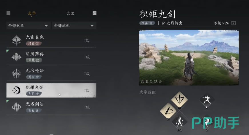 首先进行备战,先选择一套最主要的输出武学,升到最高等级,保证输出伤害最大。比如积矩九剑这种基础的,用双刀、陌刀、长枪等,都有强力的输出武技,一样可以作为主输出选择。