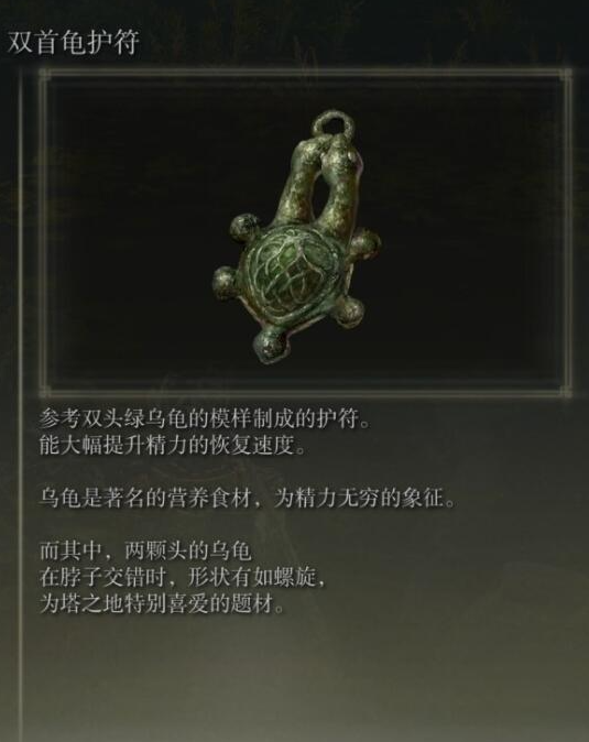 为了让自己艾尔登法环中变得更强,大家就要了解艾尔登法环黄金树之影绿龟护符在哪?因为该道具的能力以及效果很不错,当大家成功佩戴之后,便可节省不少事情。用了它能够更好地击败boss。此外该道具的全名叫做双首龟护符,外表长得像一只绿色的乌龟,很值得大家拥有。