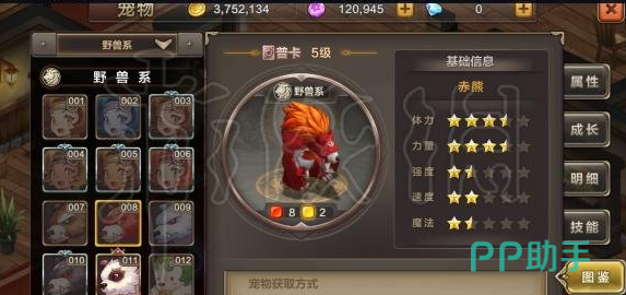 赤熊属于野兽系的宠物,属性成长值120,在体力和力量上有着明显优势,可以持续作战,在攻坚战中可以起到非常好的效果。体力主要体现在生存能力强,力量体现在生存能力强,对于一些缺乏操作技巧速度的玩家非常适合。