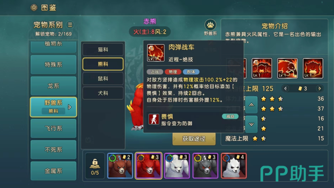 那么赤熊的克制关系如何呢,它主要是克制植物系宠物,还能半克制飞行系,综合克制能力还是比较强的。赤熊代表性技能是肉弹战车,可以对竖排敌人目标造成伤害,并且还能附带畏惧效果,持续2回合。这种畏惧效果可以使对方的指令变为防御,也是非常有用的一种限制效果。