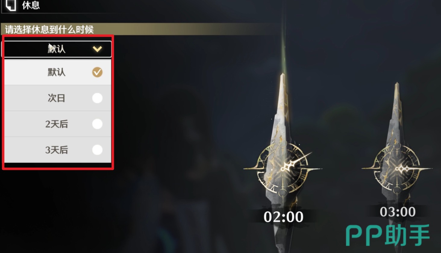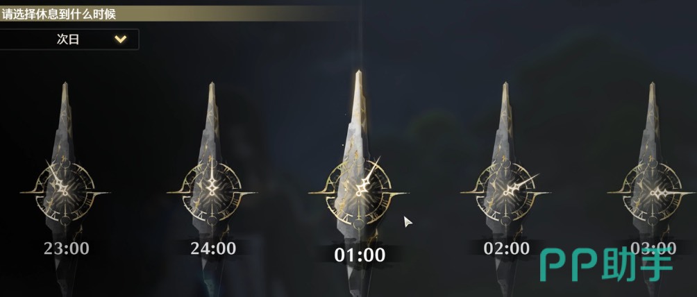 除此之外,时间系统的左上角,“休息”下方可以点击“默认”,进行天数的选择。鸣潮可以将天数最长调整到3天后,时间跨度还是挺大的,能更方便玩家进行任务。那么在“休息到第二天”的任务里。玩家将日子调整为“次日”即可。