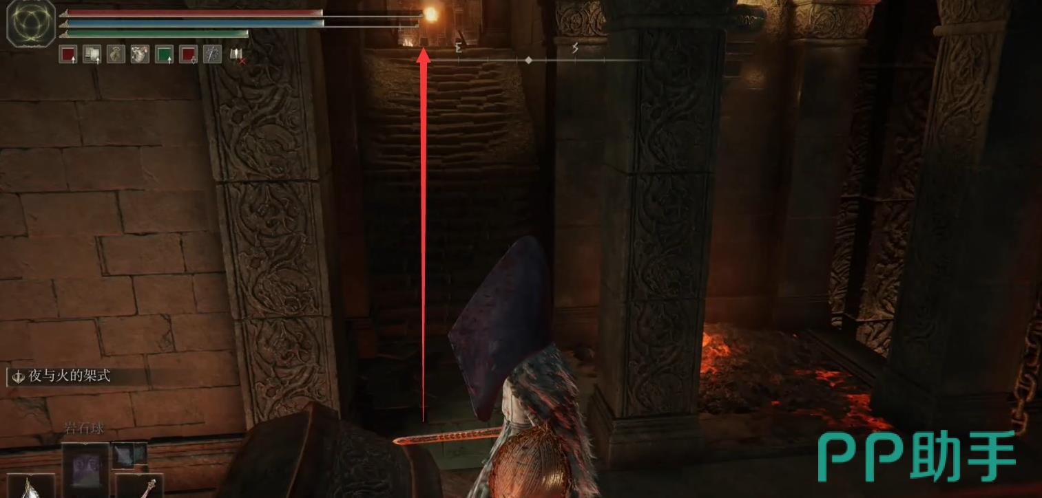 接着继续的跳到铁棍上面,可以攀爬在铁棍上,等到终点之后,朝着右边拐,马上就可以调查。在调查完毕之后就可以获取铁砧大锤,除了这一个东西之外,玩家也可以得到古龙岩锻造石。