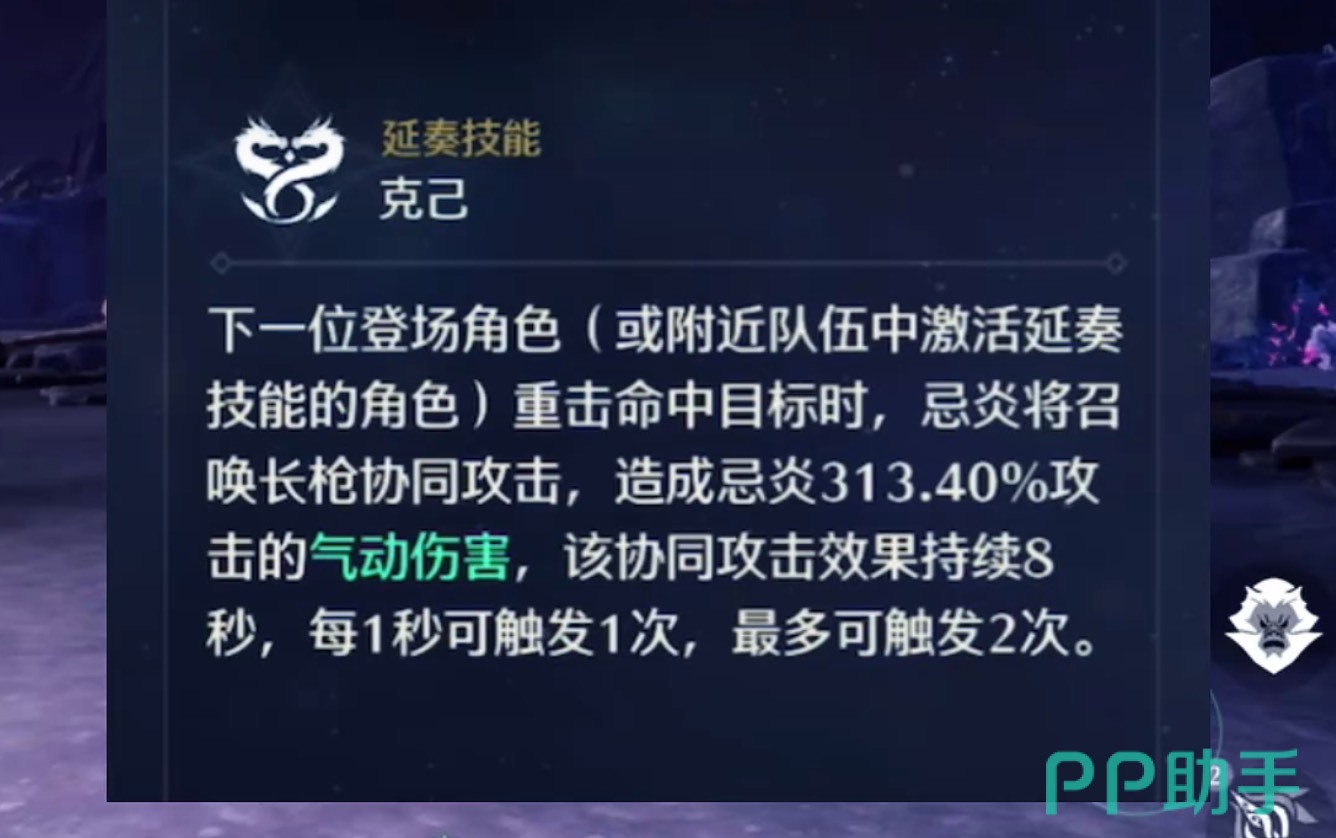 而延奏是角色切换时所打出的技能。当协奏技能的能量条攒满时,点击右侧有光圈的队友,当前在场战斗的角色就会退场,而角色退场的时候就会打出这个延奏技能。比如忌炎在协奏能量攒满后退场,就会召唤长枪,与下一个出场的队友进行协同攻击,相当于在后台打一段时间的伤害。