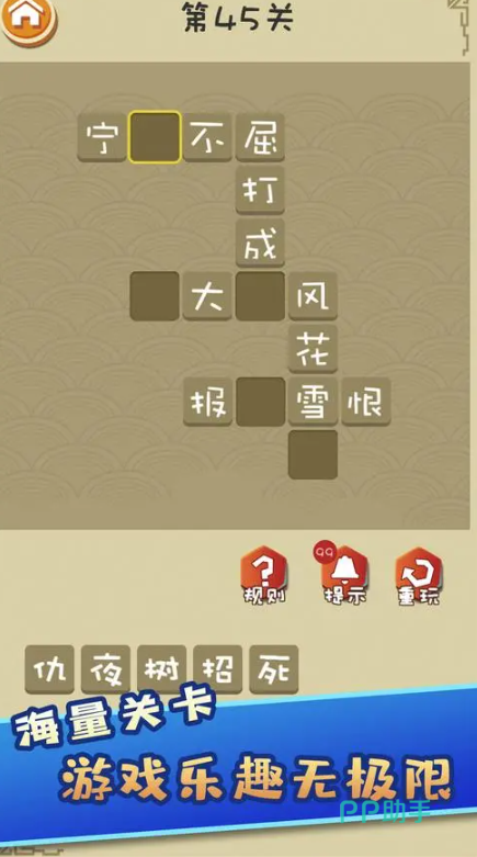 它不仅考验玩家对成语的深刻理解和丰富知识,更通过独特的游戏机制,让玩家在寻找正确汉字填入空白的过程中体验到文学的韵味。游戏背景采用如水彩画般柔和的色调,营造出一种宁静而充满智慧的游戏氛围。玩家在享受轻松休闲的同时,也能不断丰富自己的成语库。