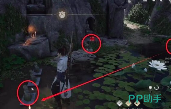 事件的发生其实就在将军祠堂附近的一个山洞里,与画面当中的猫咪进行对话,然后把小石像按照位置要求搬到对应的石板上即可完成时间。完成该事件后,玩家就可以收集到相对应的任务奖励30个长明玉,10个清河探索度,2500的经验和2500的周元通宝,这些奖励将在后期更有利于玩家对于各种武器道具的购买和等级角色的提升。