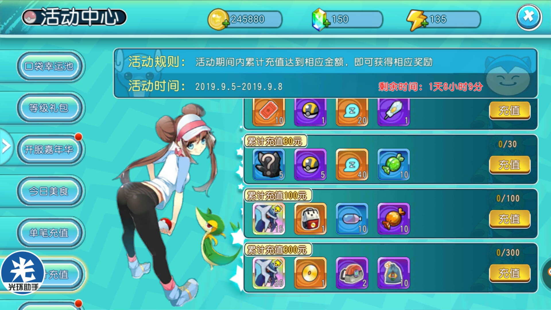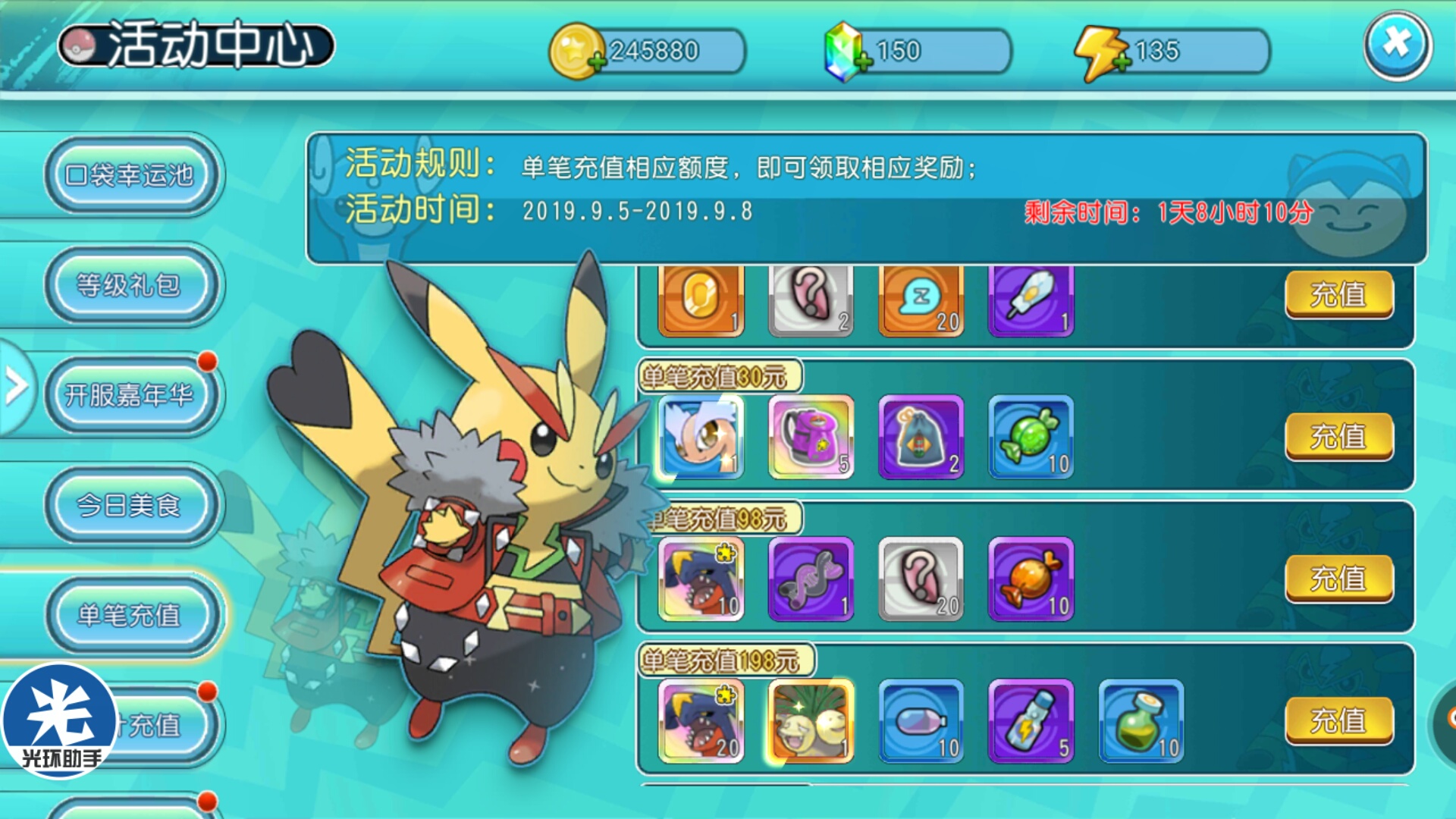 充值:单笔充值30元中的礼品包括10个小神奇糖果,单笔充值98元中含10个大神奇糖果。累计充值30元即可获得10个小神奇糖果,累计充值100元可获得10个大神奇糖果。累计充值8天可以领取10个小神奇糖果。