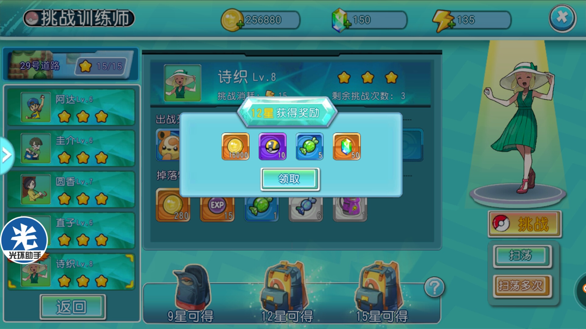 该关卡设置在副本中,挑战不同的训练师可以获得小神奇糖果和中等神奇糖果,以三星通关的可以进行扫荡,多次扫荡可以获得很多神奇糖果,且积累到9星、12星、15星可以获得不同等级的神奇糖果。